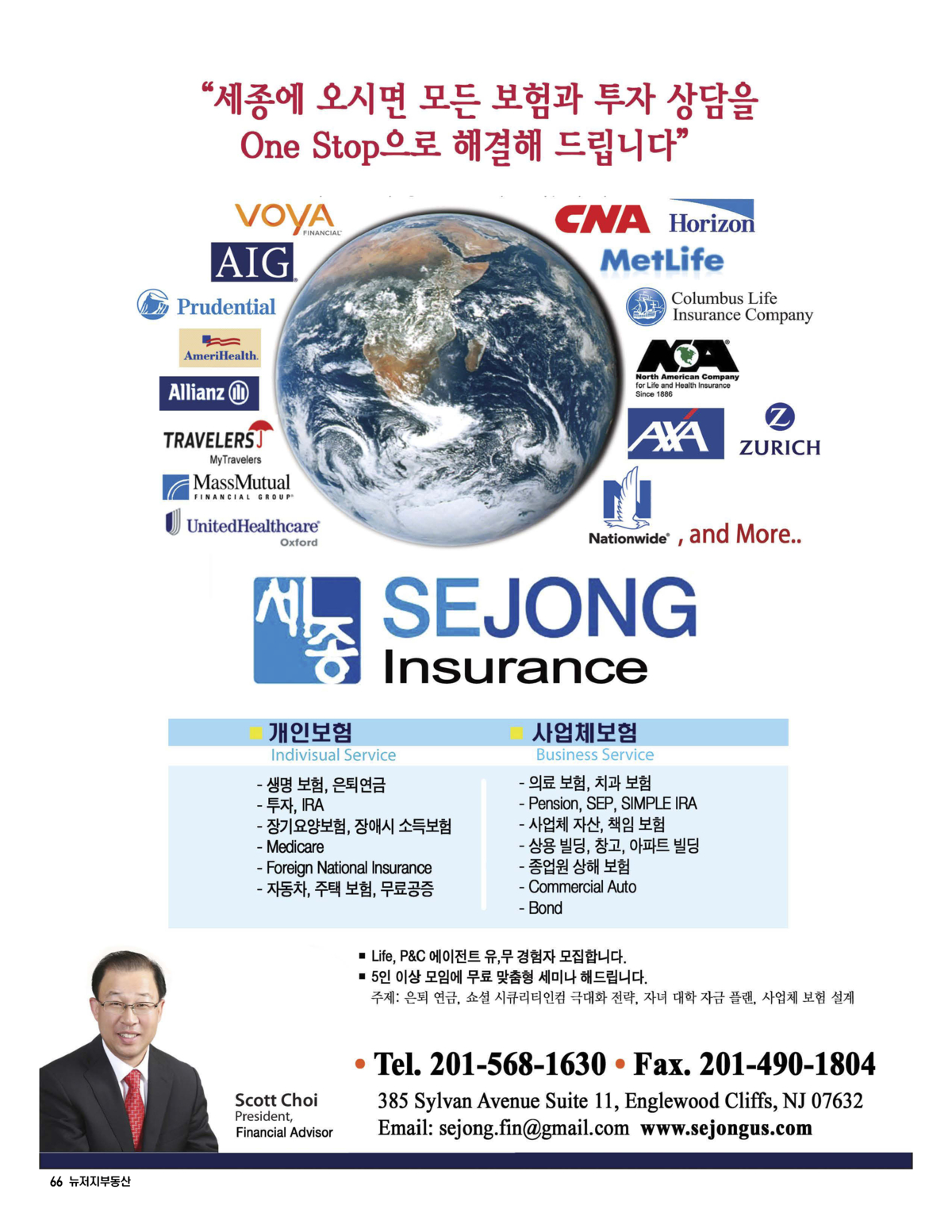 세종보험은 개인 및 가족을 위한 생명보험, 은퇴연금, 투자, 자동차보험, 집보험을 제공하며 사업체를 위한 직원건강보험,사업체보험, 종업원상해보험, SEP IRA, 401K를 제공합니다.